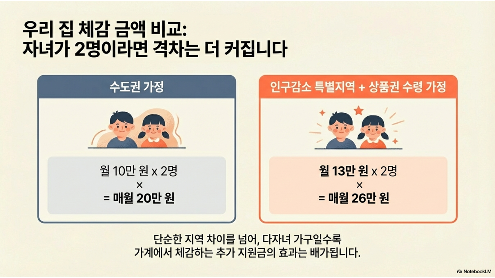 자녀가 2명이라면 매월 최대 26만 원까지 체감됩니다.